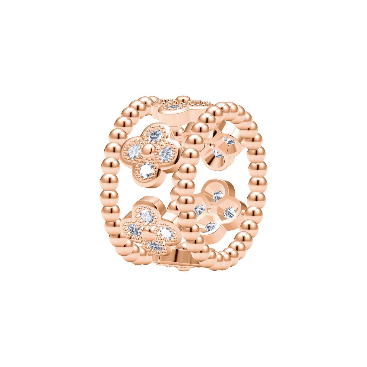 Features dense beads, four-leaf clover/dart